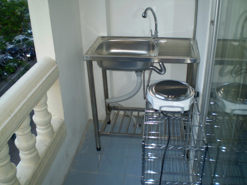 นอกห้องในระเบียงมีห้องครัวพร้อมอ่างล้างจานและเตาน้ำ